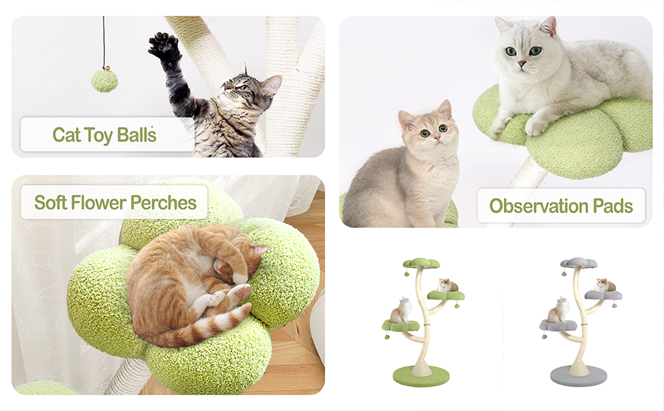 Multi-tiered floral design--- This three-tiered cloud-shaped luxury cat tree stands approximately 48.4 inches tall, featuring three petal-shaped platforms and three cat balls to provide ample space for play and relaxation. Its steel frame and engineered wood construction ensure stability and safety during play. Each platform supports up to 50 lbs, making it ideal for multi-cat households and seamlessly complementing any decor style.