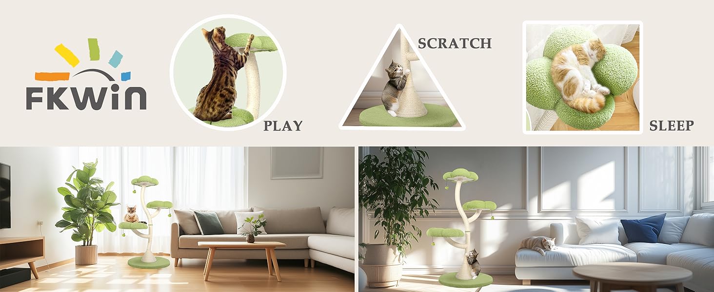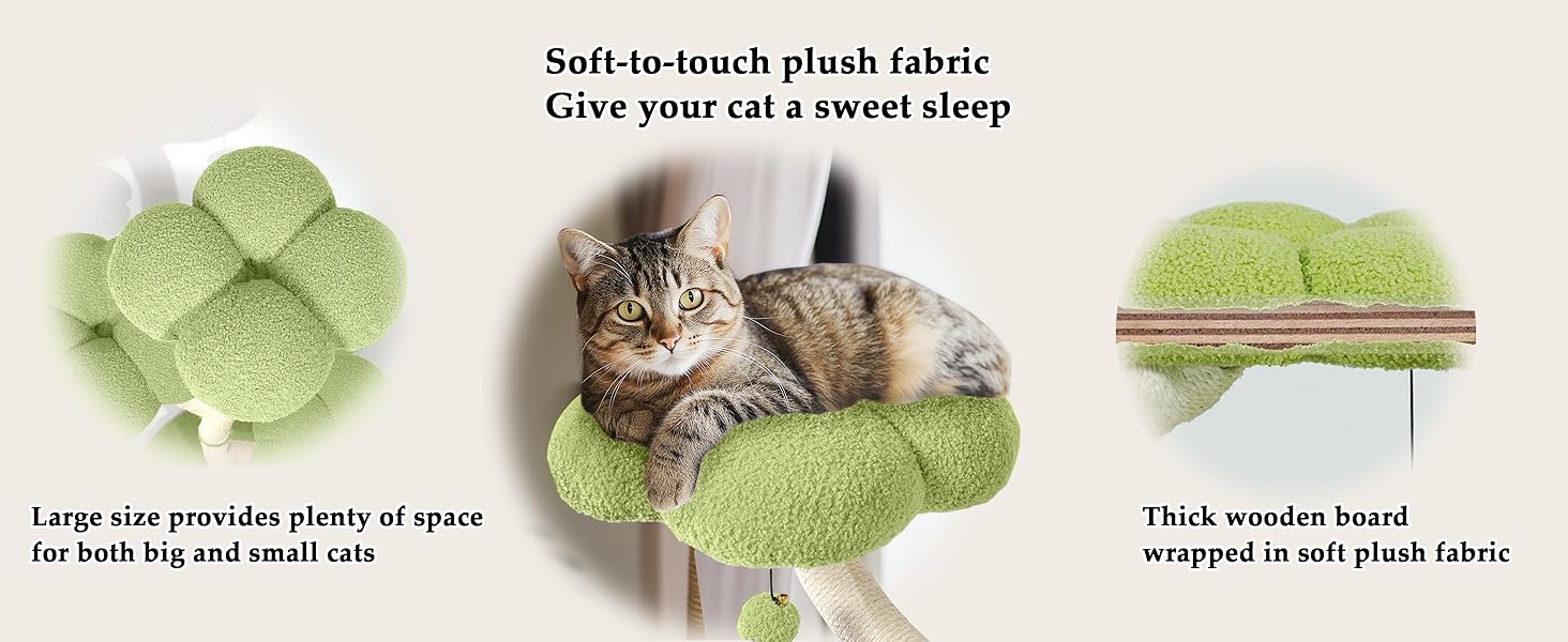 Natural Sisal Rope & Plush Materials---Posts are tightly wrapped in durable, scratch-resistant sisal rope, protecting your sofa from claw damage. Soft plush pads provide cozy resting spots. Whether stretching out on spacious cushions or scratching sisal posts, this cat tree is your feline's ultimate play paradise.