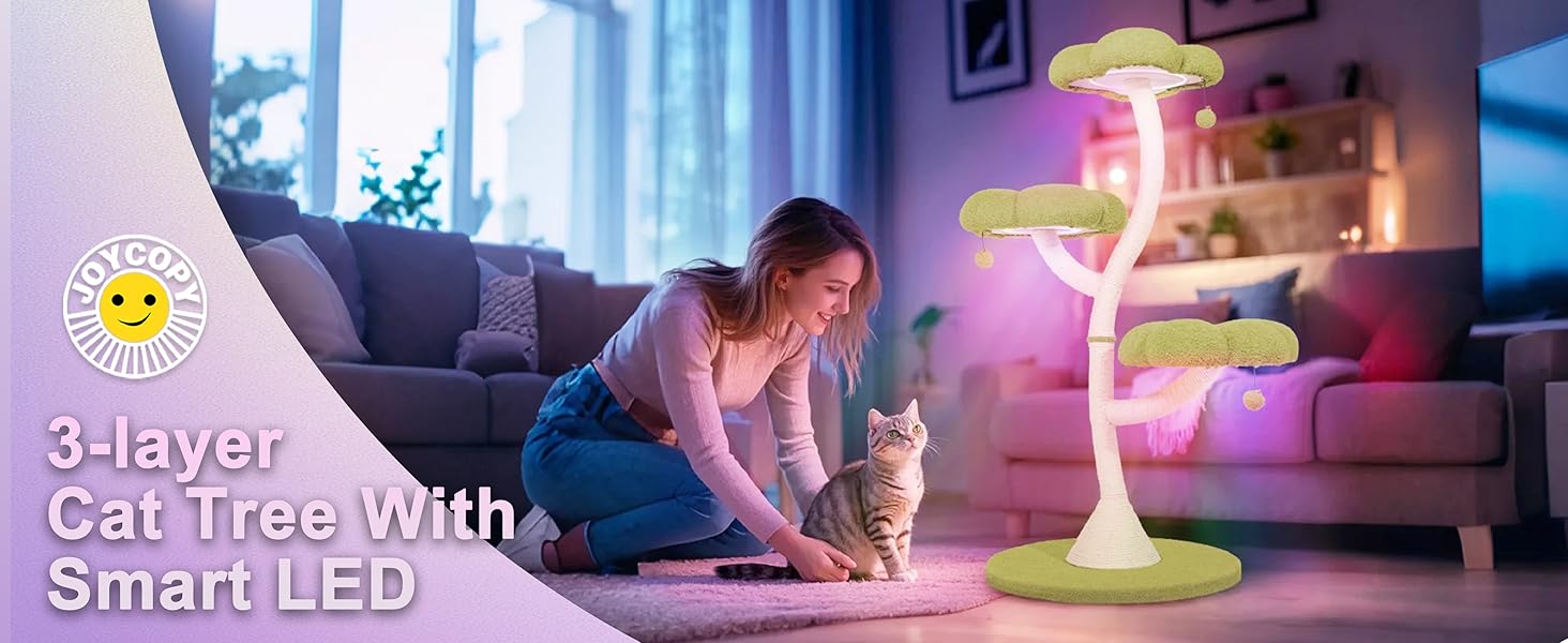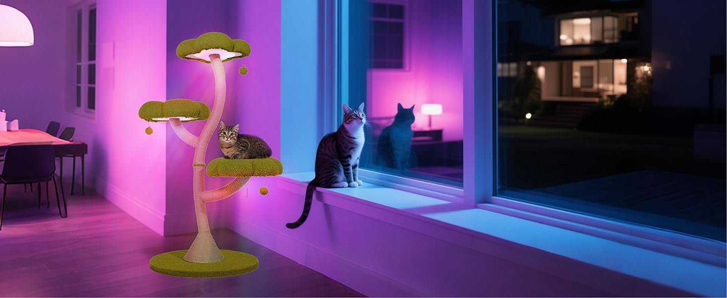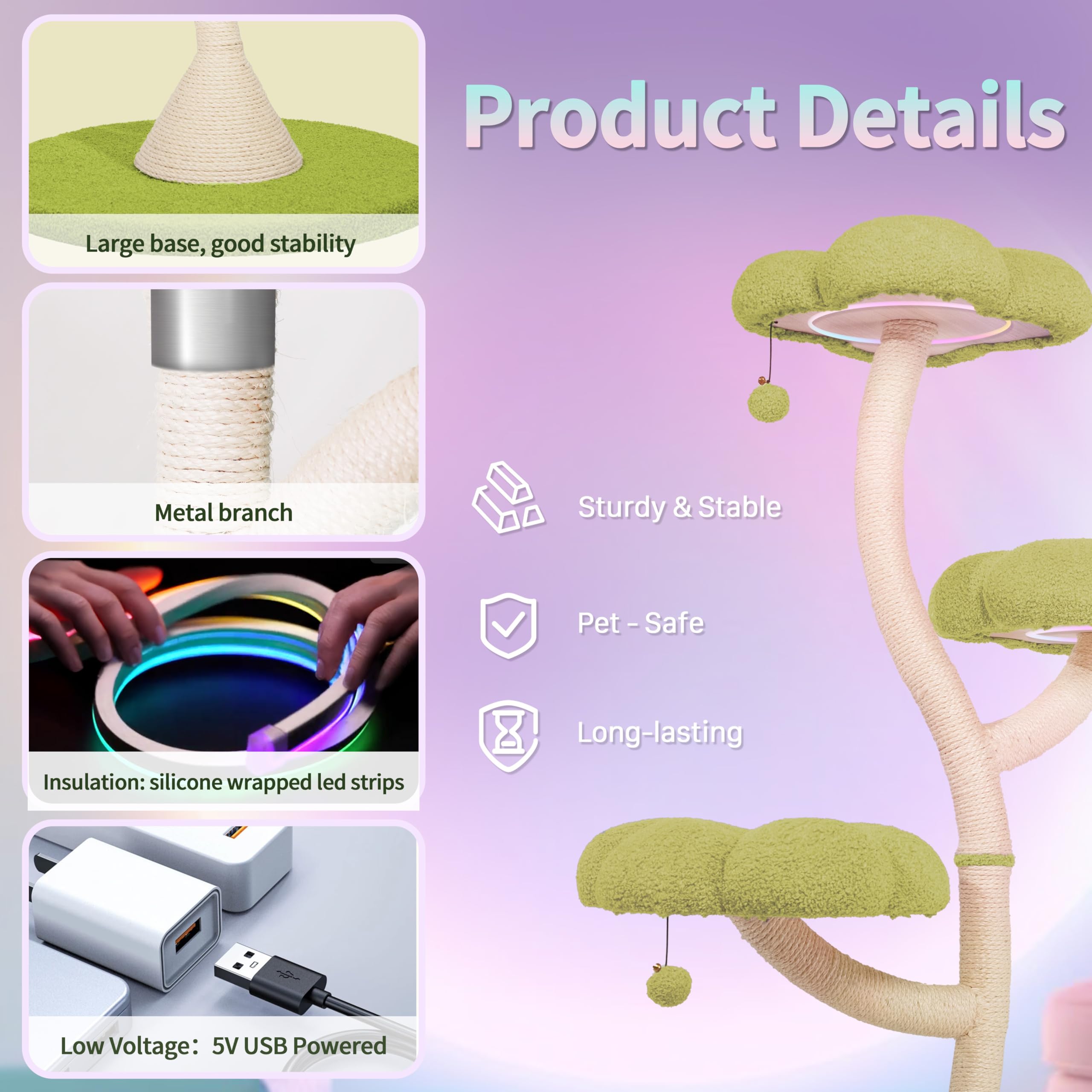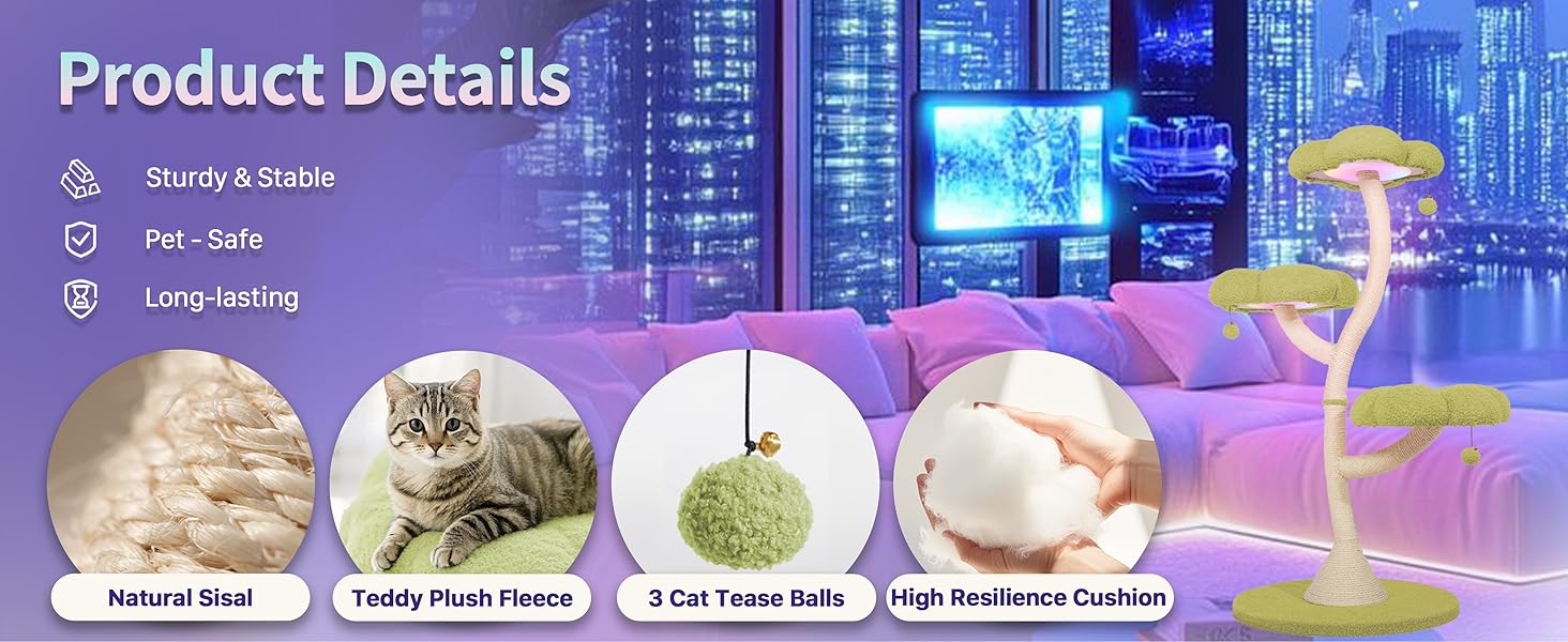 Multi-tiered floral design--- This three-tiered cloud-shaped luxury cat tree stands approximately 48.8 inches tall, featuring three petal-shaped platforms and three cat balls to provide ample space for play and relaxation. Its steel frame and engineered wood construction ensure stability and safety during play. Each platform supports up to 30 lbs, making it ideal for multi-cat households and seamlessly complementing any decor style.